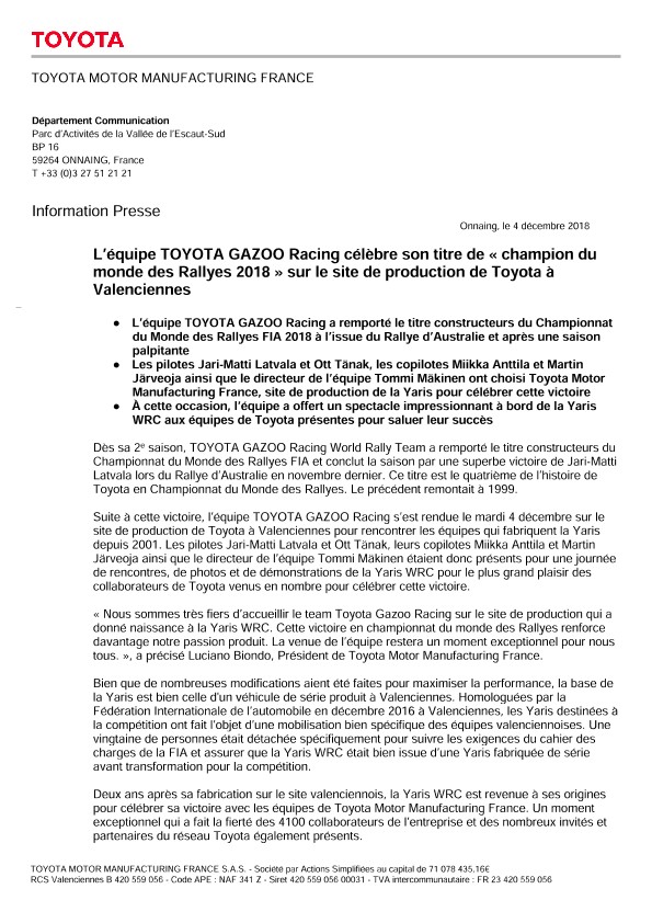 L’équipe TOYOTA GAZOO Racing célèbre son titre de « champion du monde des Rallyes 2018 » sur le site de production de Toyota à Valenciennes
