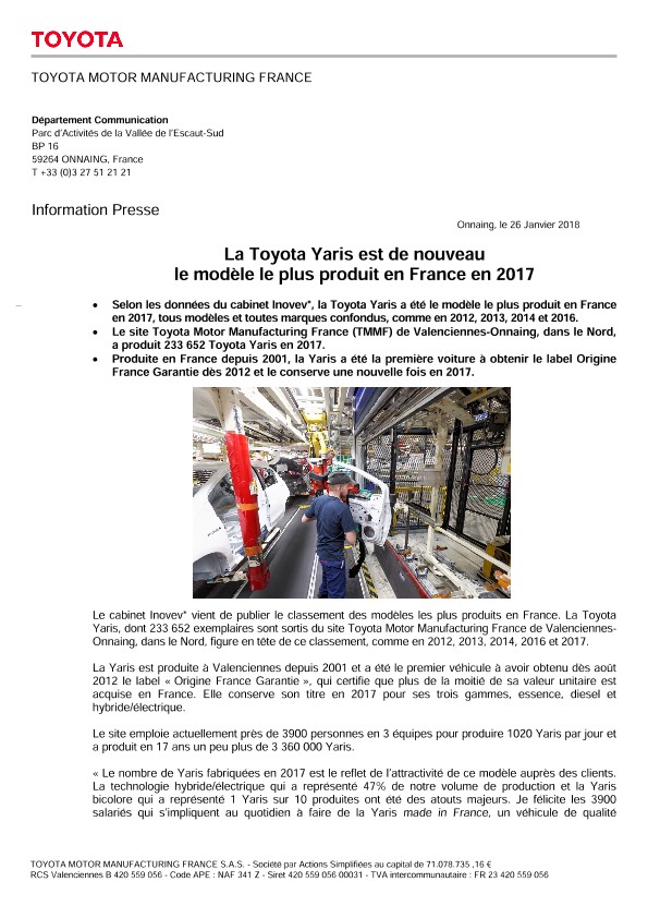 - Le site Toyota Motor Manufacturing France (TMMF) de Valenciennes-Onnaing, dans le Nord, a produit 233 652 Toyota Yaris en 2017.