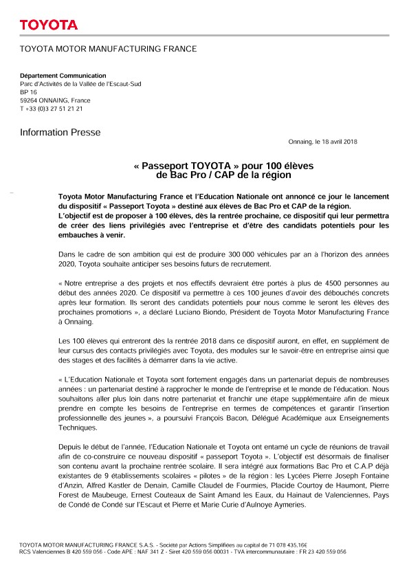 « Notre entreprise a des projets et nos effectifs devraient être portés à plus de 4500 personnes au début des années 2020. Ce dispositif va permettre à ces 100 jeunes d’avoir des débouchés concrets après leur formation. Ils seront des candidats potentiels pour nous comme le seront les élèves des prochaines promotions », a déclaré Luciano Biondo, Président de Toyota Motor Manufacturing France à Onnaing.