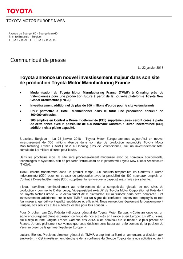 Bruxelles, Belgique – Le 22 janvier 2018 - Toyota Motor Europe annonce aujourd'hui un nouvel investissement de 300 millions d'euros dans son site de production automobile Toyota Motor Manufacturing France (TMMF) situé à Onnaing près de Valenciennes, soit un investissement total cumulé de 1,4 milliard d'euros pour le site.