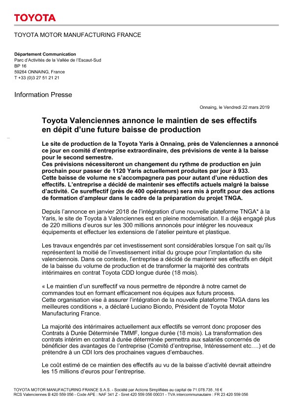 Le site de production de la Toyota Yaris à Onnaing, près de Valenciennes a annoncé ce jour en comité d’entreprise extraordinaire, des prévisions de vente à la baisse pour le second semestre. Ces prévisions nécessiteront un changement du rythme de production en juin prochain pour passer de 1120 Yaris actuellement produites par jour à 933. Cette baisse de volume ne s’accompagnera pas pour autant d’une réduction des effectifs. L’entreprise a décidé de maintenir ses effectifs actuels malgré la baisse d’activité. Ce sureffectif (près de 400 opérateurs) sera mis à profit pour des actions de formation d’ampleur dans le cadre de la préparation du projet TNGA.