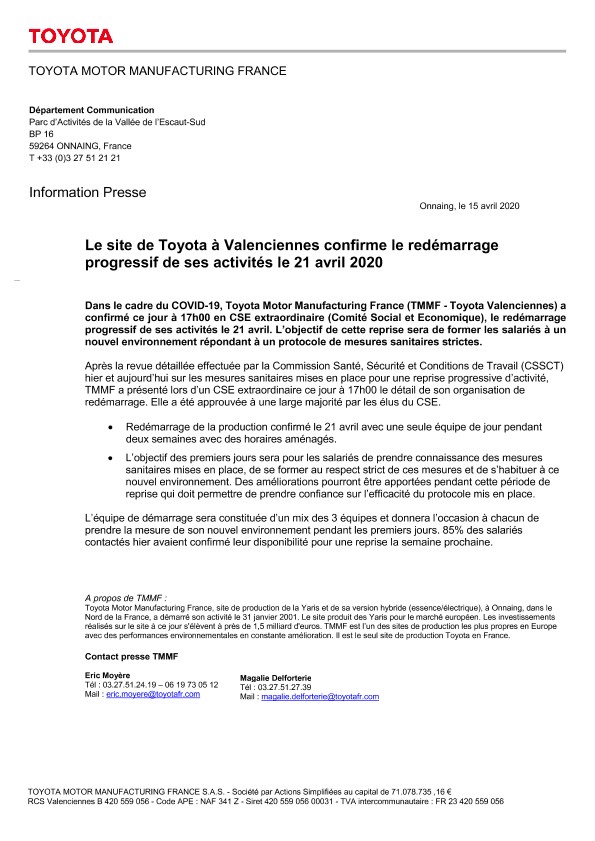 Dans le cadre du COVID-19, Toyota Motor Manufacturing France (TMMF - Toyota Valenciennes) a confirmé ce jour à 17h00 en CSE extraordinaire (Comité Social et Economique), le redémarrage progressif de ses activités le 21 avril. L’objectif de cette reprise sera de former les salariés à un nouvel environnement répondant à un protocole de mesures sanitaires strictes.