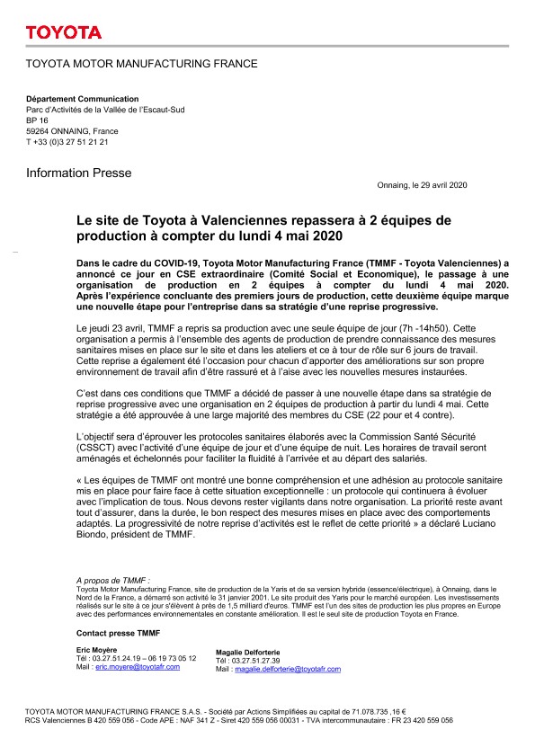 Dans le cadre du COVID-19, Toyota Motor Manufacturing France (TMMF - Toyota Valenciennes) a annoncé ce jour en CSE extraordinaire (Comité Social et Economique), le passage à une organisation de production en 2 équipes à compter du lundi 4 mai 2020. Après l’expérience concluante des premiers jours de production, cette deuxième équipe marque une nouvelle étape pour l’entreprise dans sa stratégie d’une reprise progressive.