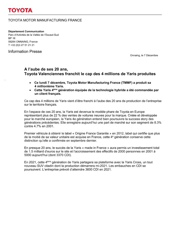 - Ce lundi 7 décembre, Toyota Motor Manufacturing France (TMMF) a produit sa 4 millionième Yaris.