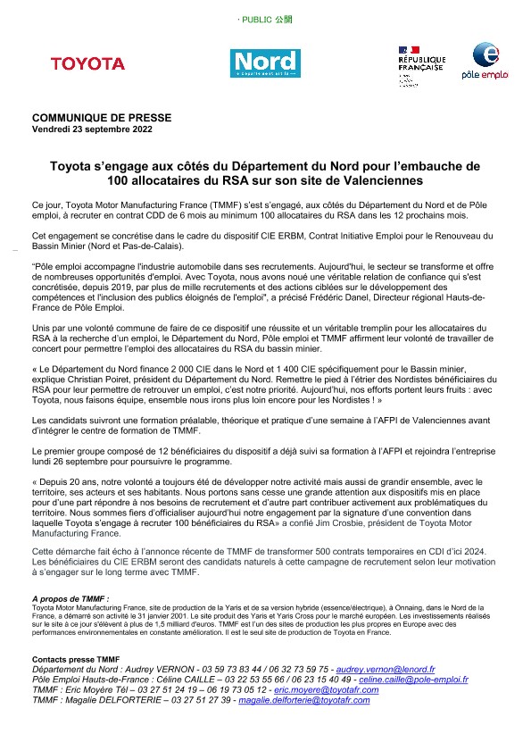 Ce jour, Toyota Motor Manufacturing France (TMMF) s’est s’engagé, aux côtés du Département du Nord et de Pôle emploi, à recruter en contrat CDD de 6 mois au minimum 100 allocataires du RSA dans les 12 prochains mois.