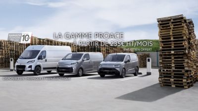 (1) Exemple pour un PROACE CITY Fourgon tôlé Medium 1.5L 100 BVM Start Blanc Glacier neuf au prix exceptionnel de 16905 € HT, remise de 7245 € HT déduite, au lieu de 24150 € HT. Crédit-bail 60 mois, sans premier loyer majoré, 59 loyers de 235 €/mois HT, entretien inclus et hors assurances facultatives. *Frais de dossier de 125 € HT en sus de la première échéance. Option d'achat en cas d'acquisition : 8830 € HT dans la limite de 60 mois & 100 000 km.
