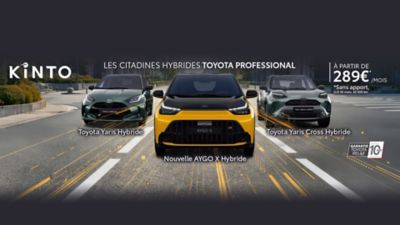 Offre non cumulable, réservée aux professionnels, valable dans la limite des stocks disponibles, pour toute commande passée jusqu’au 31/03/2026 (hors évolution du tarif constructeur et dans la limite des stocks disponibles) auprès d’un concessionnaire agréé Toyota en location longue durée selon les Conditions Générales de Location longue durée et prestations de services associés Kinto One en vigueur, et sous réserve d’acceptation du dossier par KINTO France SAS, 36 boulevard de la République 92420 Vaucresson, RCS 852 462 605 - n° ORIAS 19 006 314 consultable sur www.orias.fr. Sous réserve de variation de la fiscalité et/ou du tarif constructeur en vigueur. Montants exprimés TTC hors prestations facultatives, frais d'immatriculation et éventuels Malus.